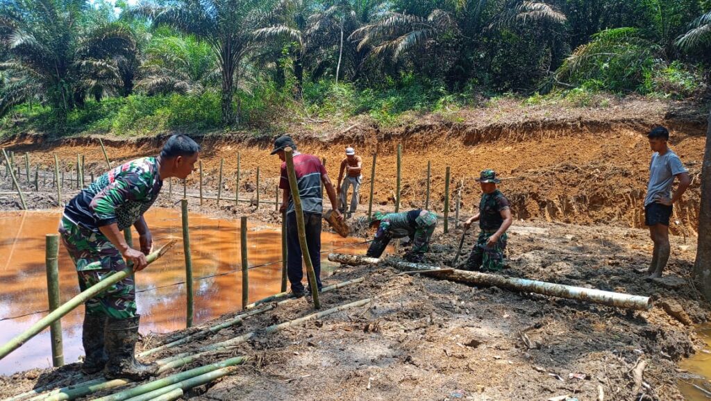 Merangin – Dalam rangka pelaksanaan program TNI Manunggal Membangun Desa (TMMD) ke-122, Satgas Kodim 0420/Sarko bersama warga Desa Bedeng Rejo, Kecamatan Bangko Barat, Kabupaten Merangin, melakukan kegiatan pembuatan pancang bambu untuk kolam ikan.