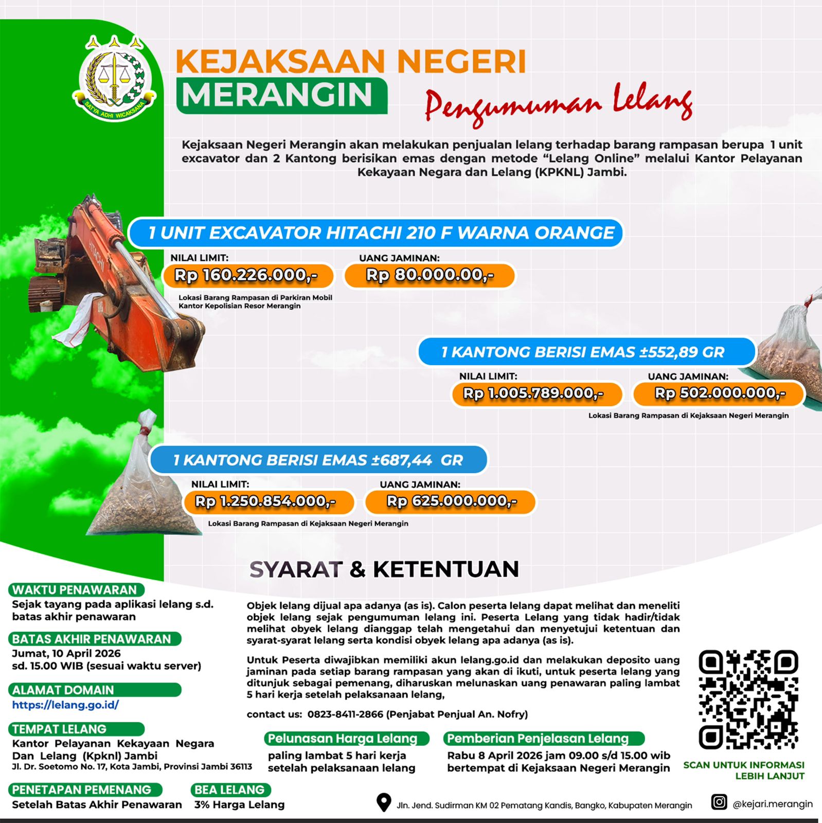 Sementara itu, dalam kegiatan lelang yang di lakukan di aula E-Auction KPKNL jambi di hadiri langsung oleh kasi PAPBB kejaksaan Merangin Nofry Hardi .S.H.M.H,Dan Risman, S.H., M.Ak. selaku pejabat lelang dari KPKNL Jambi, telah berhasil melakukan pelelangan 3 lot Barang Rampasan dari tindak pidana umum. Ketiga lot tersebut telah laku terjual dengan total sebesar Rp 3.058.869.000 .