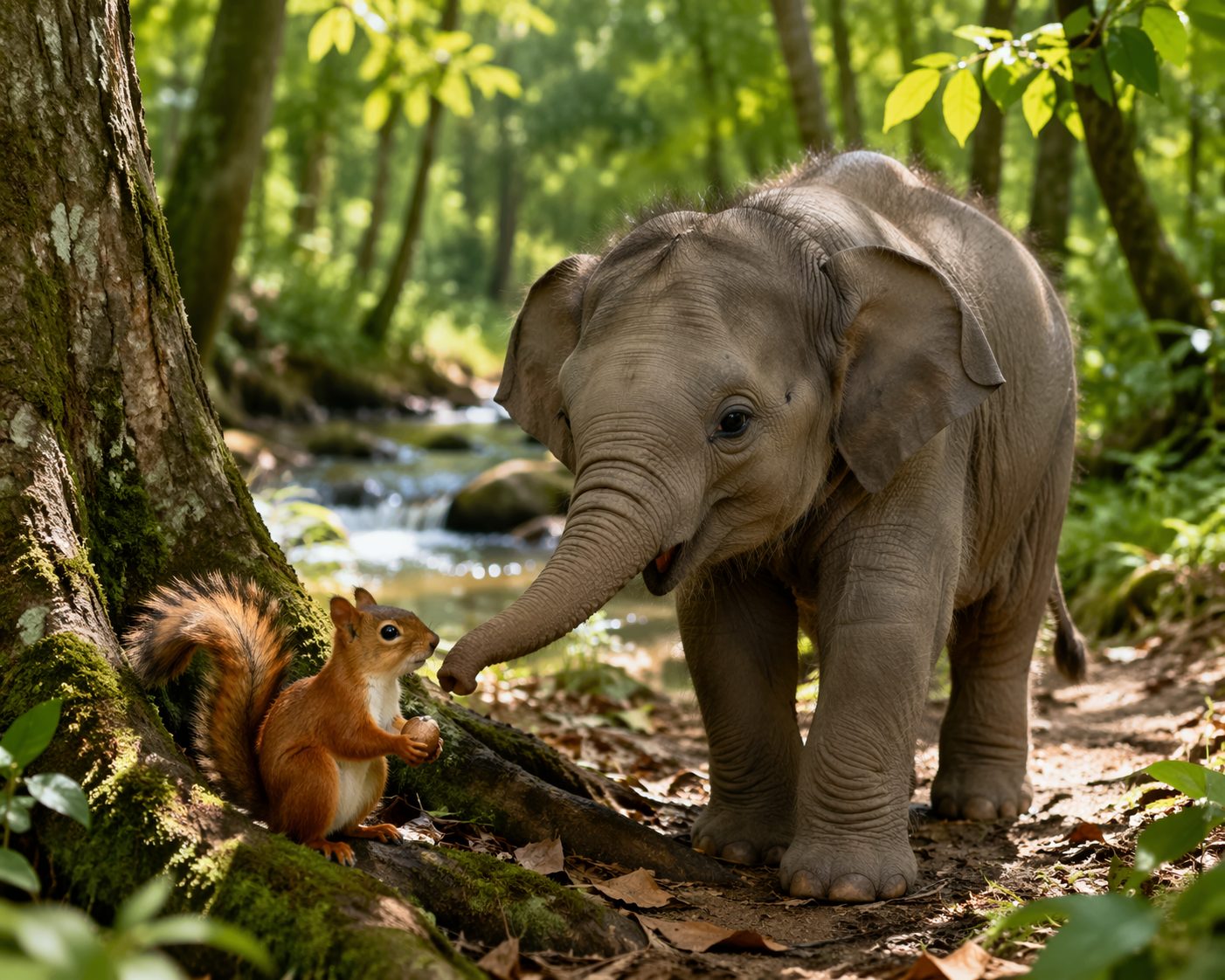 Mata kecil gajah melihat tupai yang sombong,tengah melompat di antara deru angin kencang, tubuhnya lincah menerobos daun daun cempedak.